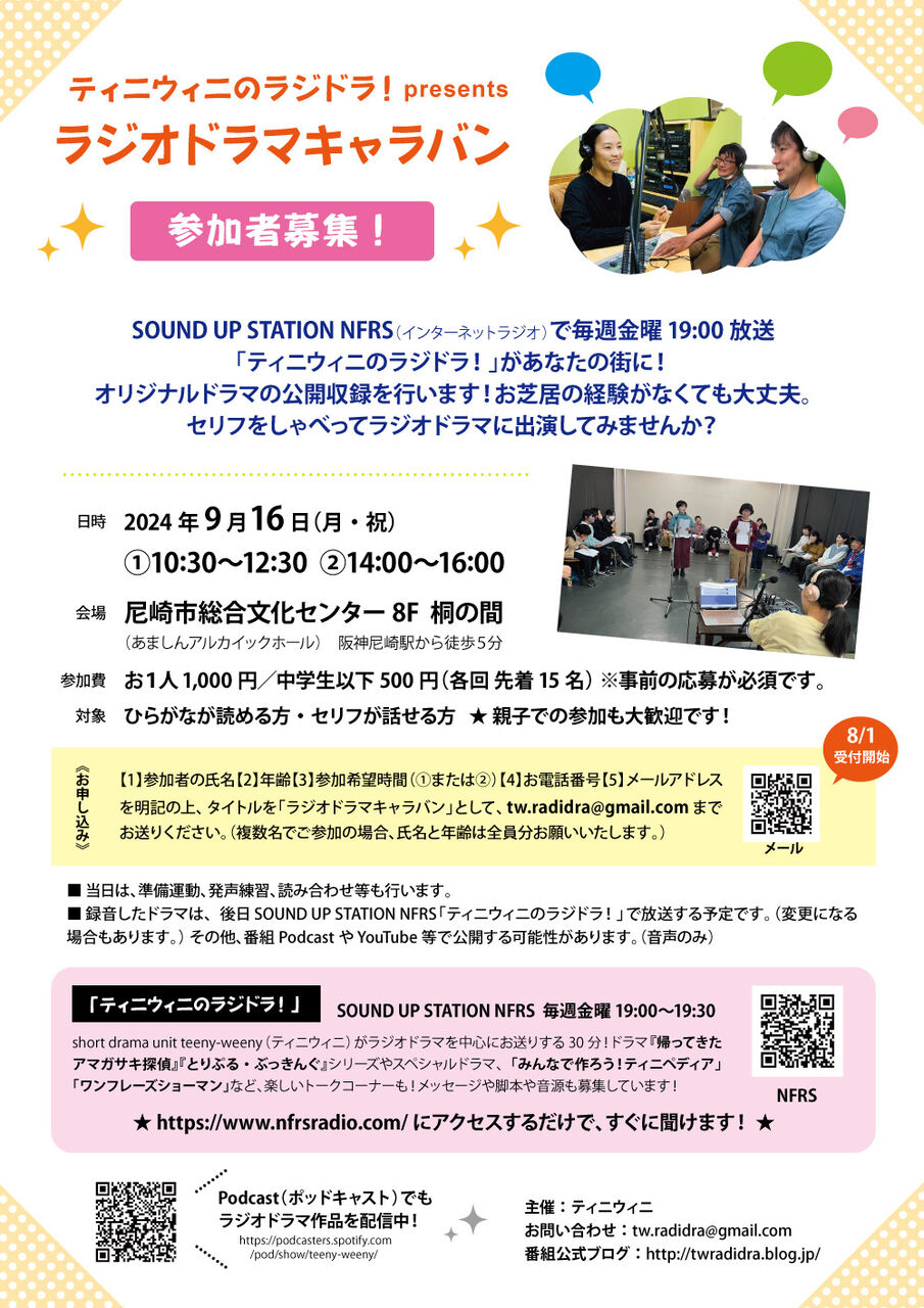 【1】参加者の氏名【2】年齢【3】参加希望時間(①または②)【4】お電話番号【5】メールアドレス を明記の上、タイトルを「ラジオドラマキャラバン」として、tw.radidra@gmail.com まで お送りください。(複数名でご参加の場合、氏名と年齢は全員分お願いいたします。)